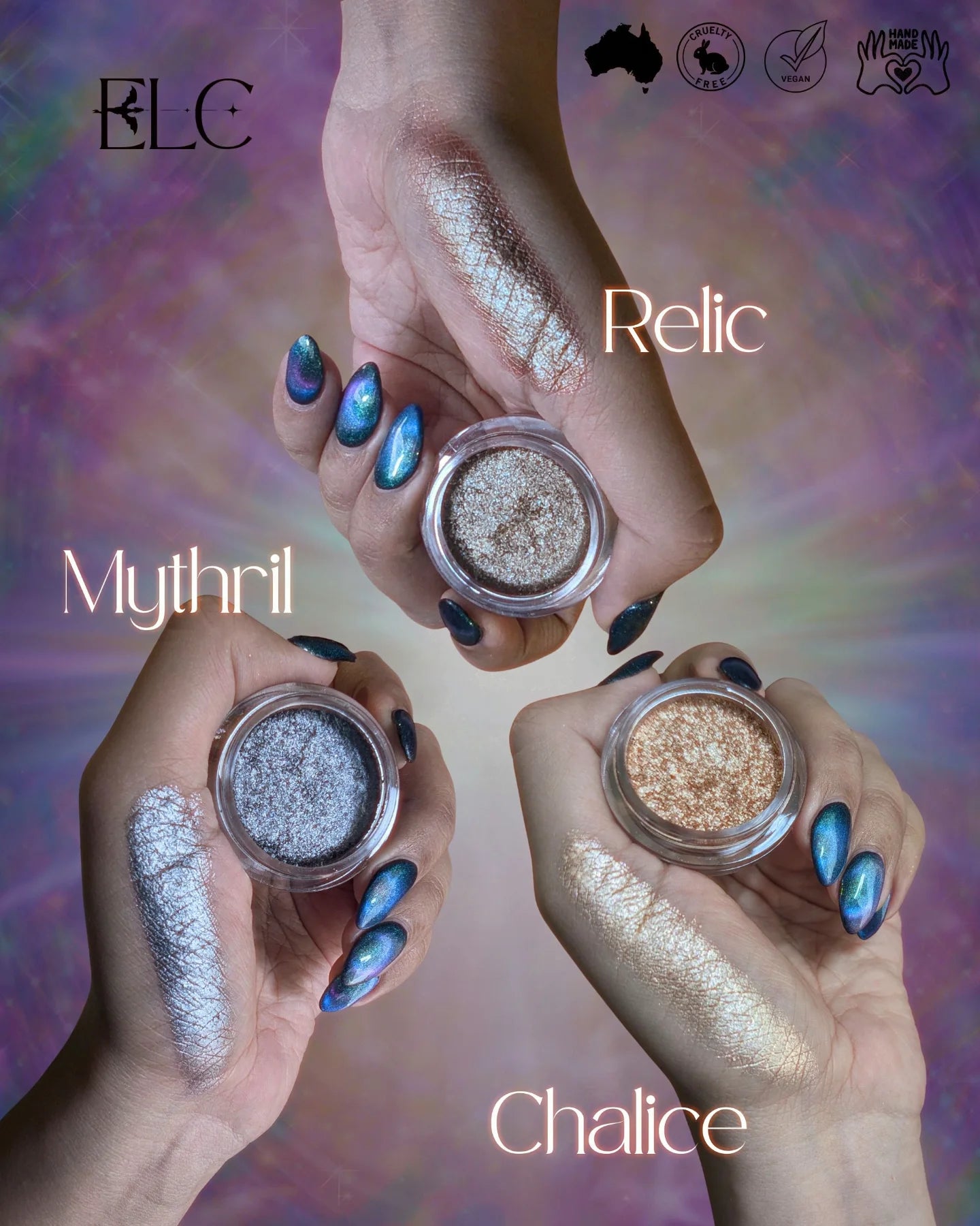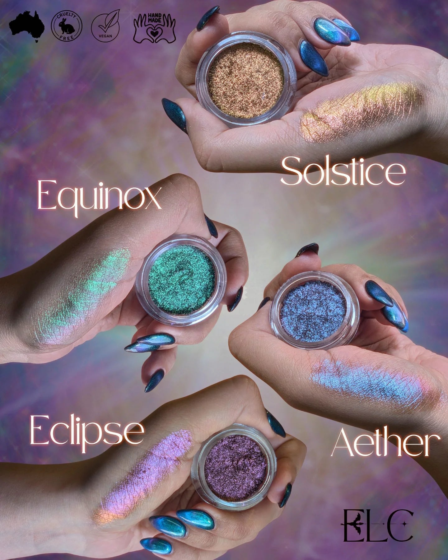 This is not mere makeup; it is a traveler's charm and a romantic's secret. Safe to grace the windows to the soul, the eyes, it can also be pressed upon the lips like a kiss of magic, or dusted across the high points of the cheeks to grant the wearer an ethereal, haunting luminescence.