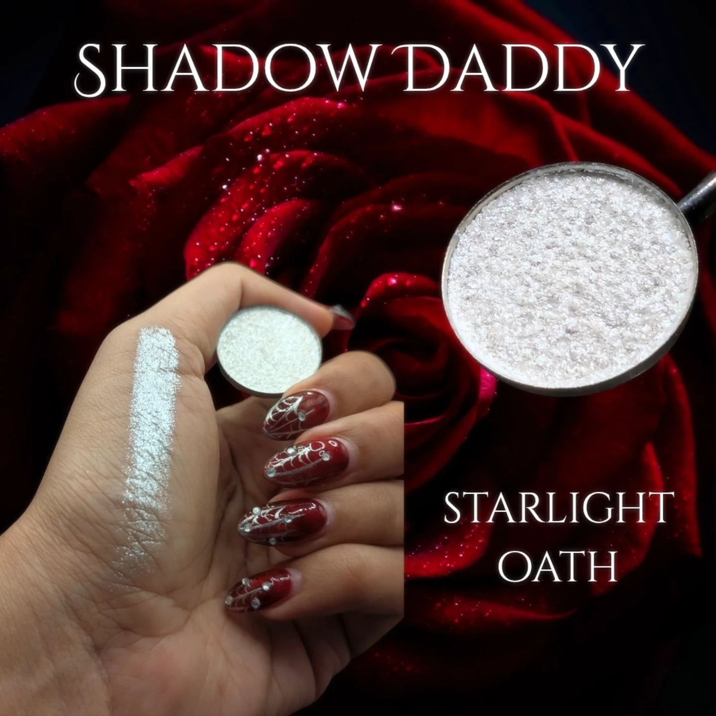 Starlight Oath - the sacred promise made under a sliver of the moon—a moment of pure, crystalline magic in the eternal darkness. This shade is a brilliant, high-sparkle white-silver that is packed with micro-fine shimmer, giving it a powerful, wet-look metallic finish.